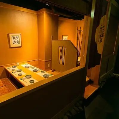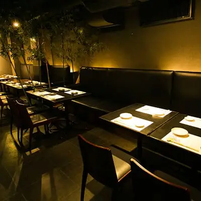 竹林に囲まれた、和の心溢れる落ち着いた店内。暖かな照明の下で、ゆっくりと流れる時間をお過ごし下さい。